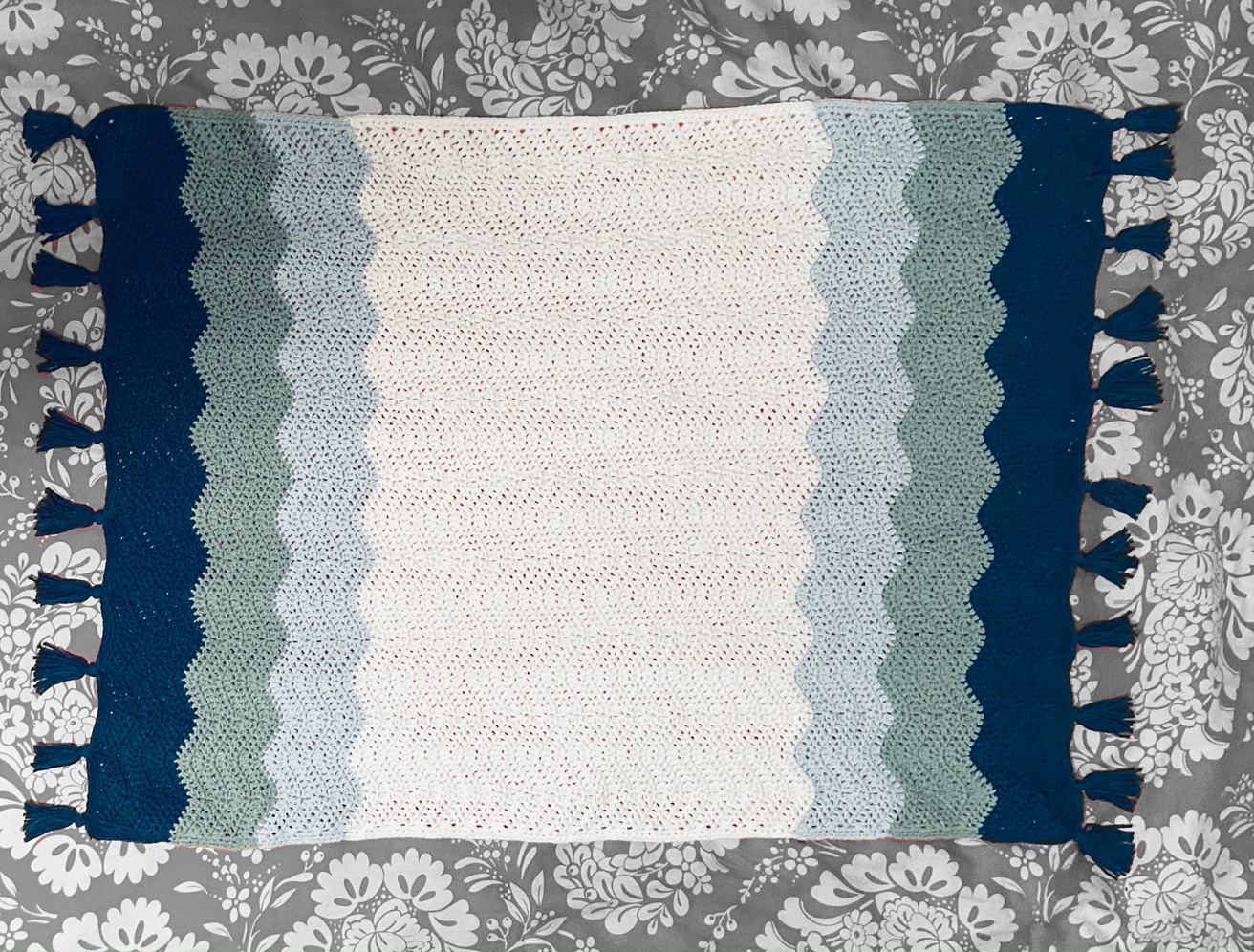- Pattern Used: Inspired by Bahama Waves Baby Blanket, but I ended up using a standard chevron pattern. And tassels! The tassels were my idea.