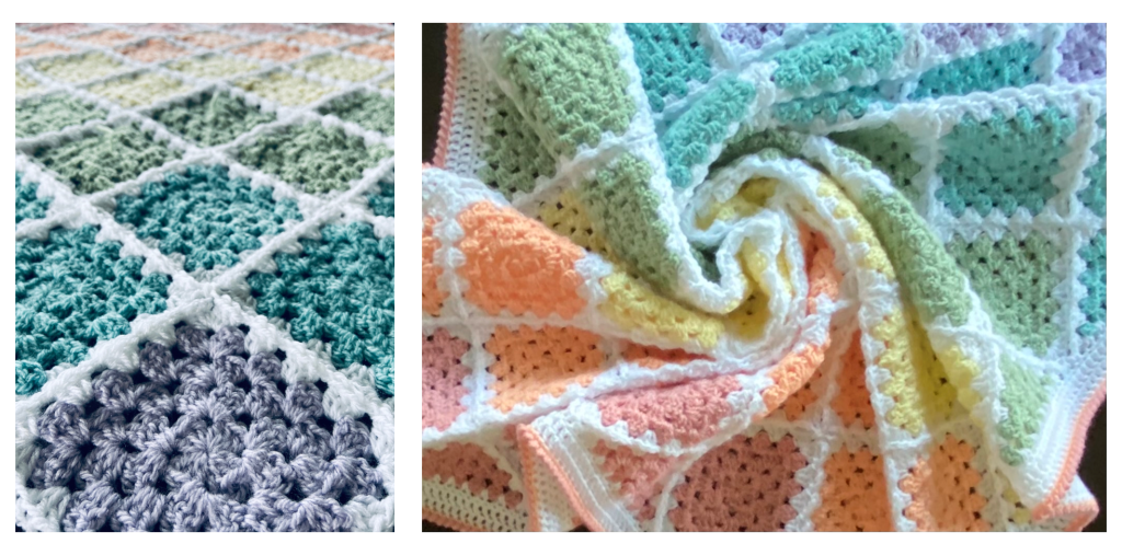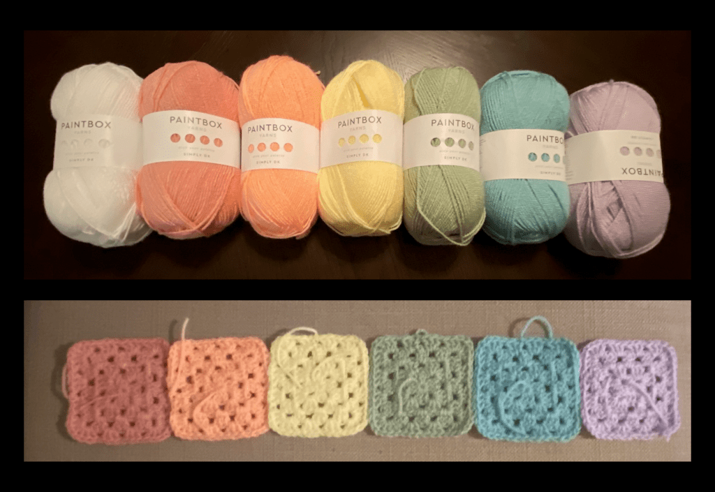 - Yarn Used: Paintbox Simply DK in Paper White, Blush Pink, Peach Orange, Banana Cream, Pistachio Green, Washed Teal and Dusty Rose.