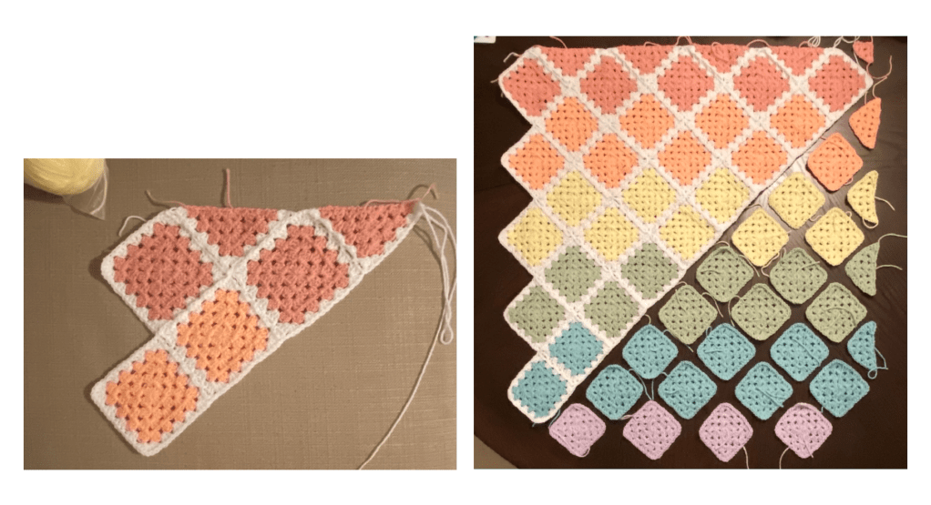 This pattern allows for “joining as you go” – the jargon for attaching granny squares throughout the process instead of making some 70-odd squares and then tackling how to turn them into a blanket. It also makes for some singularly lovely WIP imagery as the rows take shape diagonally.